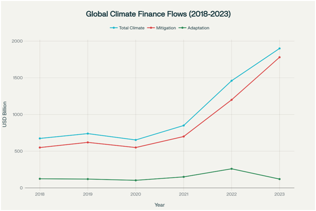 Chart 1:-Trend of global climate finance flows showing significant growth from USD 674 billion in 2018 to USD 1.9 trillion in 2023, with mitigation finance dominating the landscape
