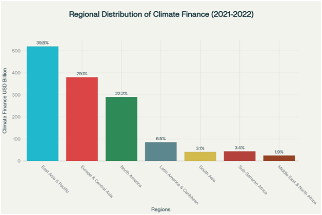 Chart 2:- Regional distribution of climate finance reveals significant disparities, with East Asia & Pacific receiving the largest share at 39.8%, while Sub-Saharan Africa receives only 3.4%