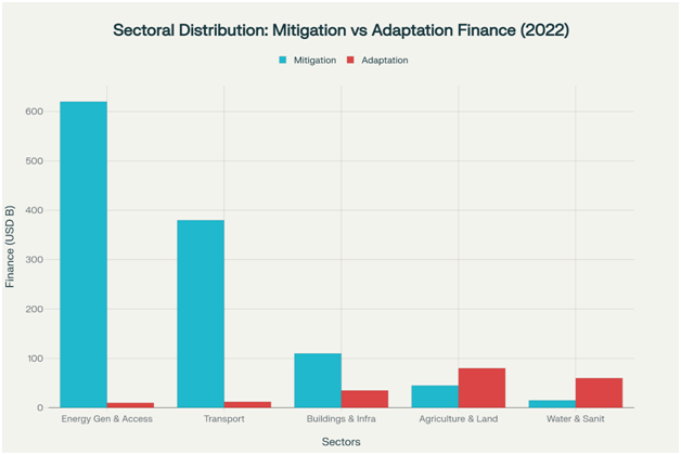 Chart 3:- Energy generation and transport sectors receive the highest mitigation finance (USD 620B and 380B respectively), while agriculture and water sectors dominate adaptation finance allocation