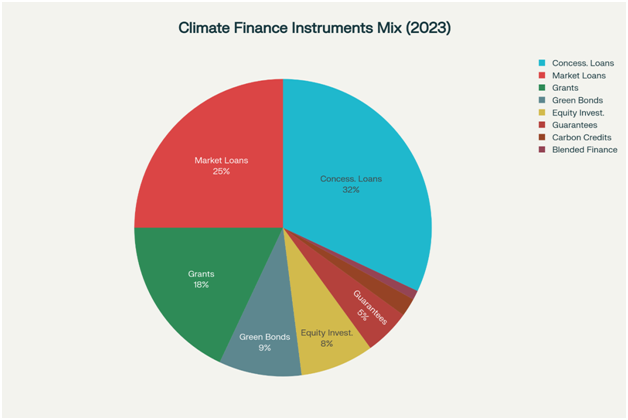 Chart 4:- Concessional loans dominate climate finance instruments at 32%, followed by market-rate loans (25%) and grants (18%), while innovative instruments like blended finance remain underutilized at 1%