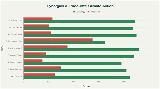 SDG 15 (Life on Land) exhibits 0.89 synergy reflecting ecosystem-based adaptation and mitigation: reforestation and land restoration sequester carbon while restoring biodiversity, improving water cycles, and protecting livelihoods. Trade-offs (0.23 score) emerge when conservation prioritizes carbon sequestration over livelihood support or when land acquisition for reforestation displaces communities.